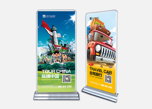 門型展架是用貼紙和PVC噴繪加上外框和底座組成,彈簧來固定畫,方便更換。如果畫面大建議使用PP紙和PVC硬片來制作。